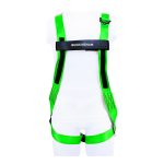 Un arnés de cuerpo completo de estilo «H» económico que cuenta con una correa de pecho de gancho y bucle y sin componentes metálicos. Se utiliza un accesorio dorsal reforzado de bucle de red para enganchar a la mitad una cuerda de seguridad que absorbe los golpes. Este arnés cuenta con un paso en las correas y no se puede ajustar la altura ni la correa de la pierna. Hecho de correas de nylon.