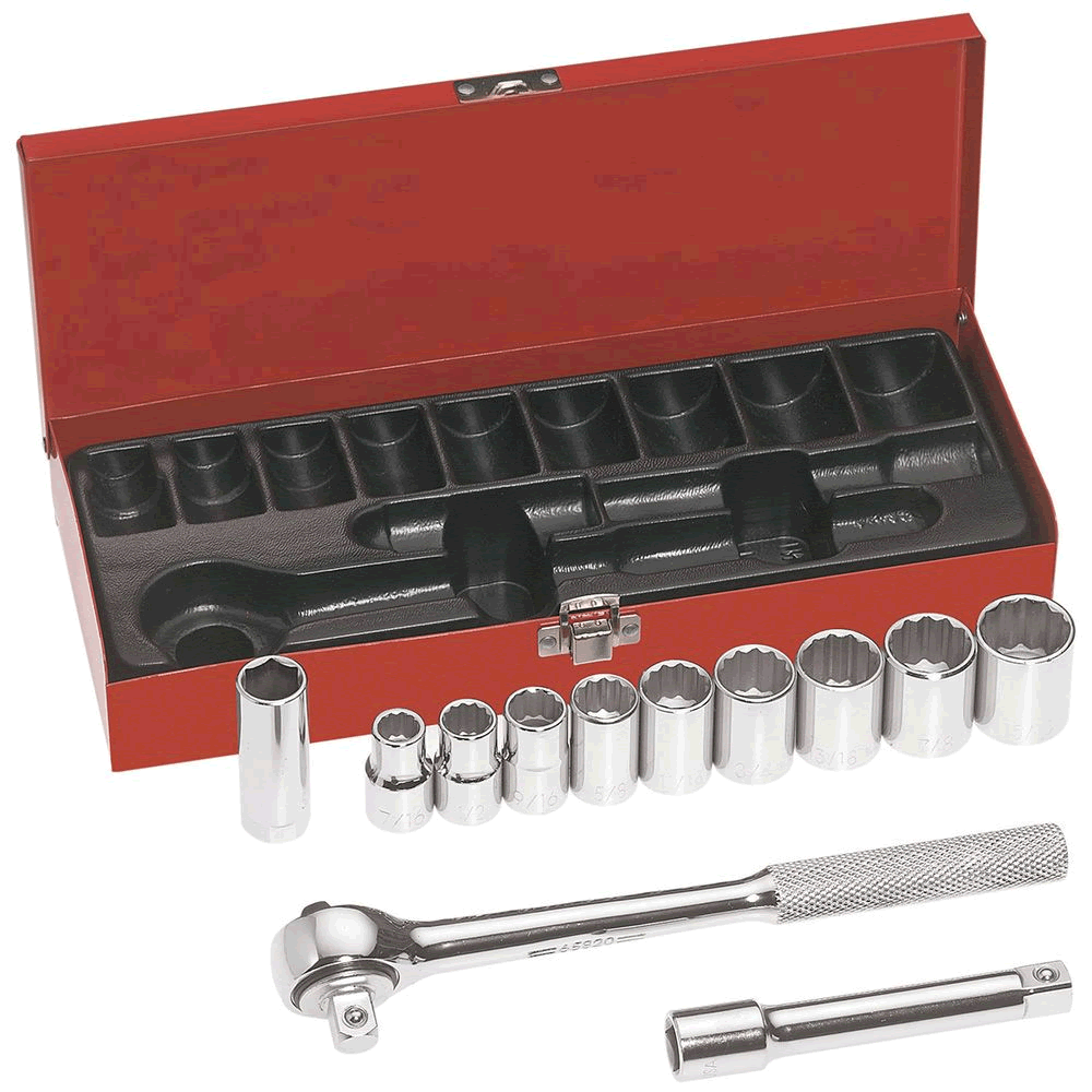 Nueve enchufes de 12 puntos: 7/16 pulgadas, 1/2 pulgadas, 9/16 pulgadas, 5/8 pulgadas, 11/16 pulgadas, 3/4 pulgadas, 13/16 pulgadas, 7/ 8 pulgadas y 15/16 pulgadas