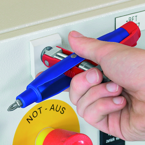 Llave para armarios de control, fácil de transportar en forma de bolígrafo con clip de sujeción. Sacando el soporte de la llave se puede disponer de cuatro perfiles de llaves diferentes. Para armarios de control y para sistemas de paso de gas, agua y electricidad. Para instalaciones técnicas de edificios p. ej.: sistemas de aire acondicionado y ventilación, válvulas de paso, cuadros eléctricos, etc.. Alojamiento universal para puntas bit de ¼ “ para puntas bit comerciales (imán permanente para la fijación). Con adaptador de 1/4″ para puntas bit en un perfil de la llave. Con 2 puntas bit reversibles: ranura en cruz PH / ranura 7,0 x 1,2 mm y TX20 / TX25. Cuerpo de herramienta: plástico, reforzado con fibra de vidrio. Perfiles de llaves: Zinc moldeado a presión. Llave para armarios de control, fácil de transportar en forma de bolígrafo con clip de sujeción. Sacando el soporte de la llave se puede disponer de cuatro perfiles de llaves diferentes. Para armarios de control y para sistemas de paso de gas, agua y electricidad. Para instalaciones técnicas de edificios p. ej.: sistemas de aire acondicionado y ventilación, válvulas de paso, cuadros eléctricos, etc.. Alojamiento universal para puntas bit de ¼ “ para puntas bit comerciales (imán permanente para la fijación). Con adaptador de 1/4″ para puntas bit en un perfil de la llave. Con punta bit: ranura en cruz PH2 y posibilidad para guardar una segunda punta bit. Con un clip para la sujeción segura. Cuerpo y clip de plástico- extensiones y partes funcionales de la llave de fundición de zinc.
