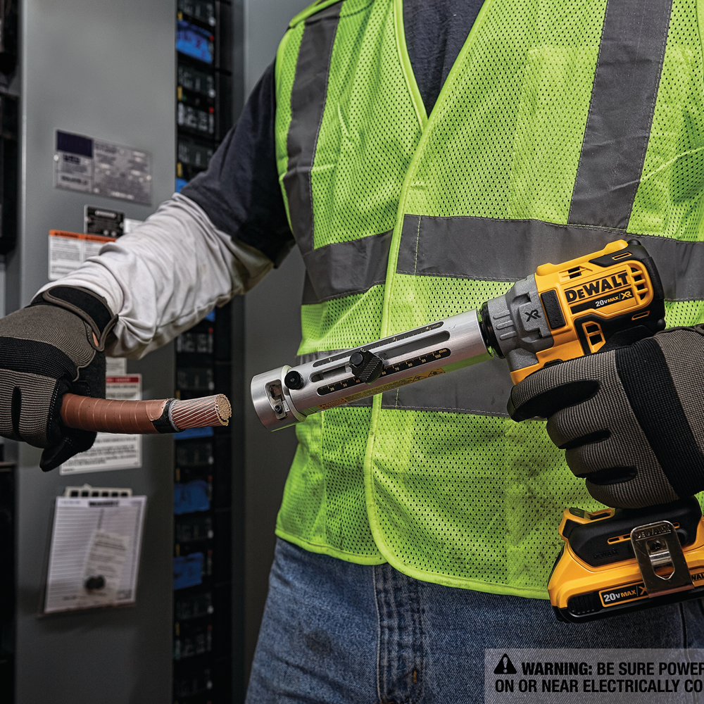 El medidor de profundidad pela constantemente el cable hasta 4 pulgadas. Tira # 6 – Cable de 750 MCM Cu / Al Los bujes de liberación rápida incluidos le permiten cambiar rápidamente los bujes para cada tamaño de cable Disparador de velocidad variable con marcha atrás para el control de velocidad La luz LED incorporada ajustable ayuda a proporcionar iluminación en la oscuridad o situaciones de poca luz La caja del kit viene con almacenamiento conveniente para herramientas, bujes, batería y cargador El sistema E-Clutch ™ ayuda al usuario a mantener el control de la herramienta si se atasca. Usando el buje apropiado, el pelacables funciona tanto en cobre (THHN / XHHW) como cable de aluminio, que cubre un rango de tamaño de 6 AWG a 750 MCM CU y 900 MCM AL