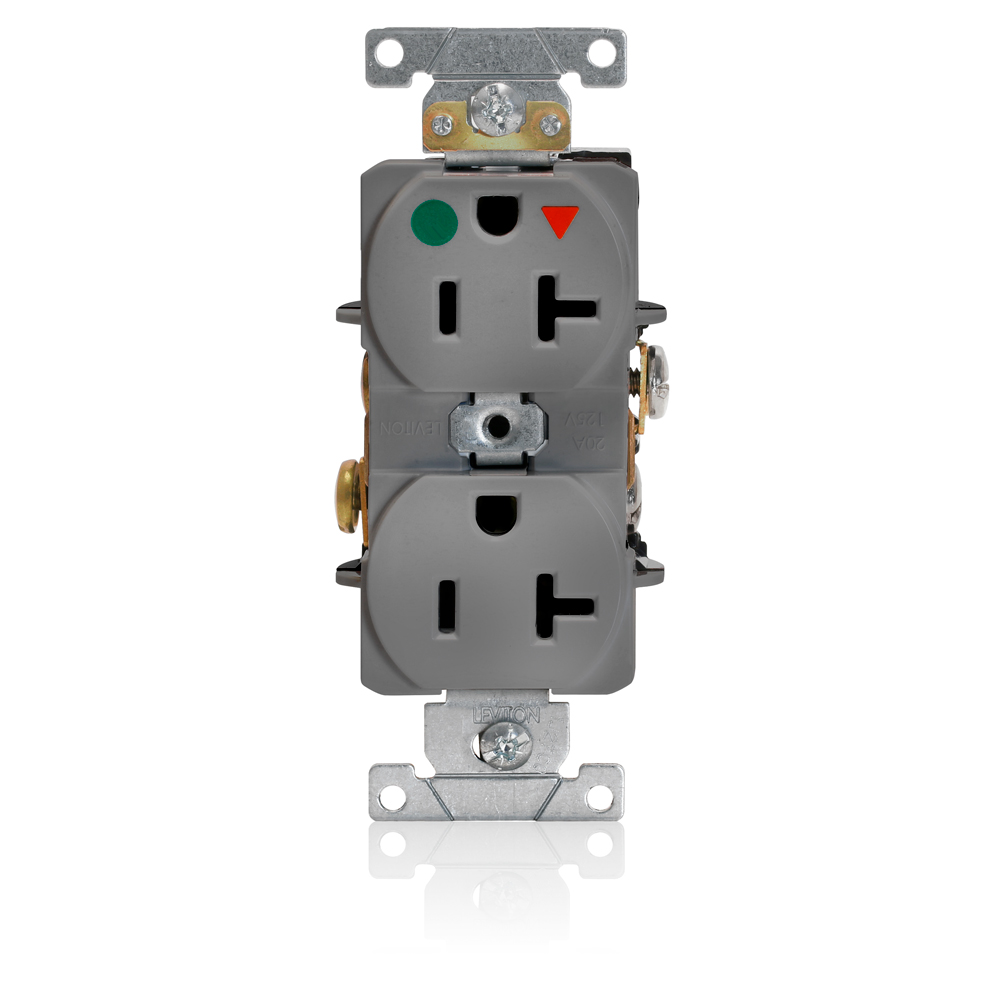 Salida de receptáculo dúplex con conexión a tierra aislada, grado hospitalario de servicio pesado, superficie lisa, 20 amperios, 125 voltios, cable posterior o lateral, NEMA 5-20R, 2 polos, 3 cables, puesta a tierra automática – Gris